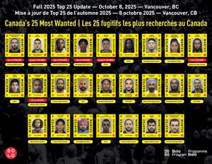 VANCOUVER, British Columbia, Oct. 08, 2025 (GLOBE NEWSWIRE) -- The faces of Canada’s most wanted fugitives filled a Vancouver news conference today as the latest iteration of the Bolo Program’s Top 25 list was unveiled, along with new incentives for members of the public to call in tips about the fugitives’ whereabouts.